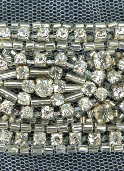 Ca. alle 3 cm ist eine ca. 1 cm hochstehende, opulente, Straßsteine Anordnung.