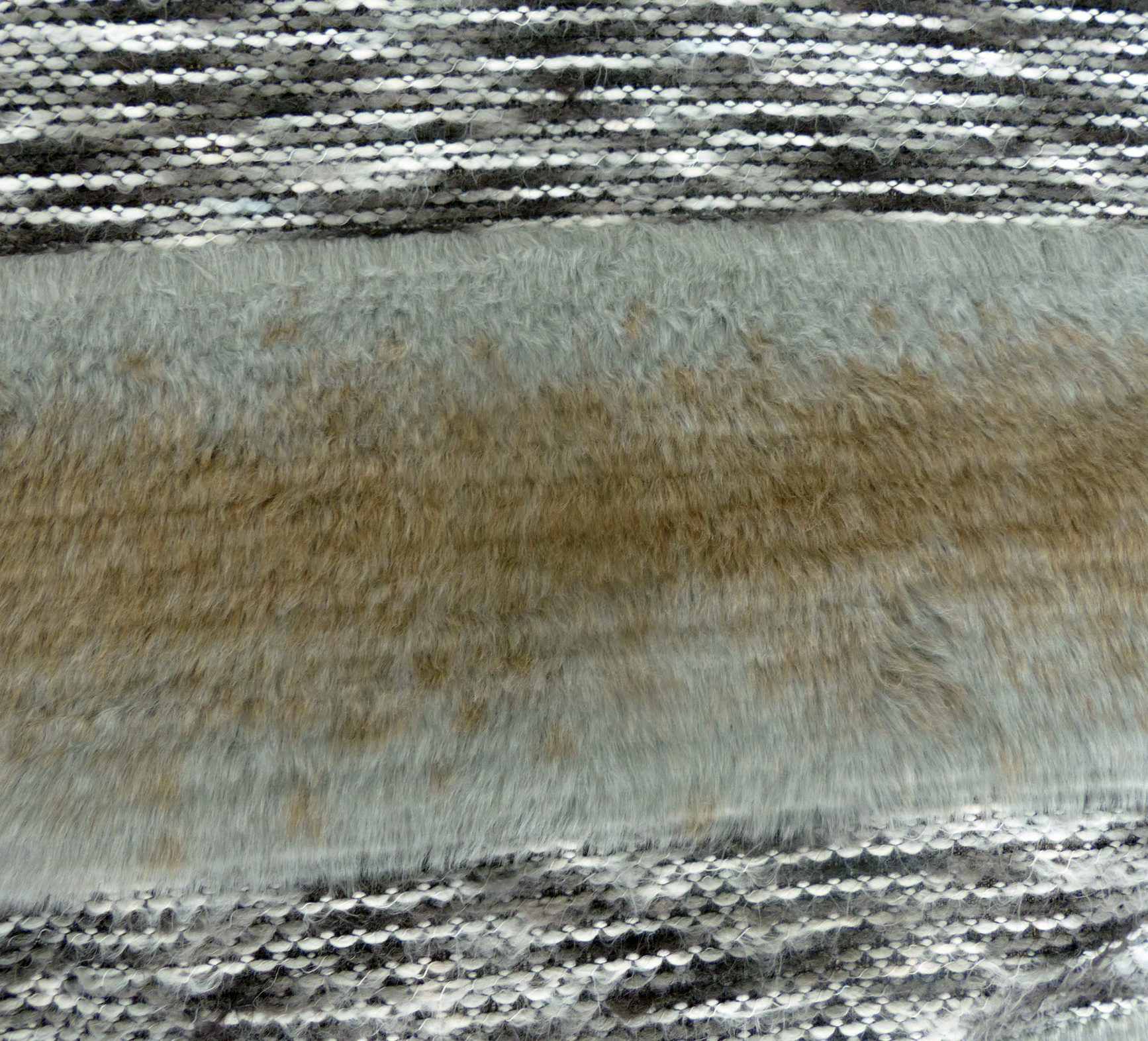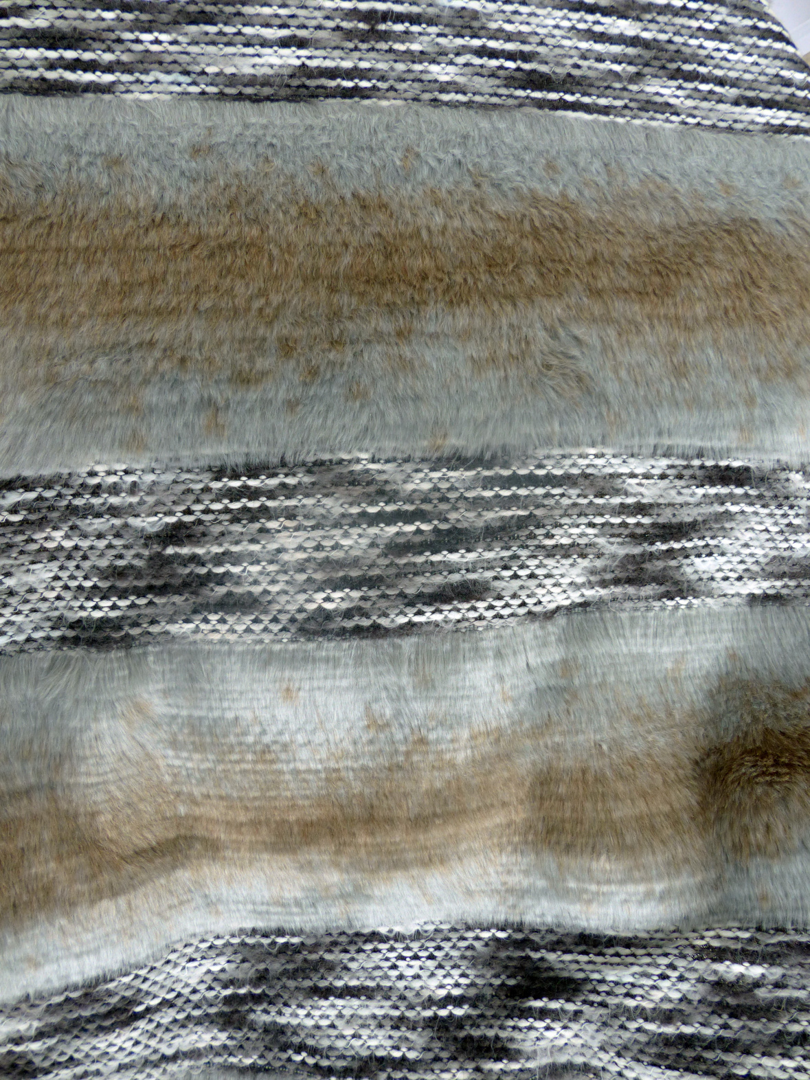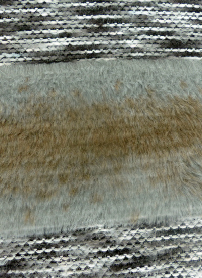 Im Wechsel von ca. 25 cm Fell, kommen ca. 15 cm eingewebte Wollfäden und wird in der Mitte der Wollfäden abgeschnitten. Das heißt es wird nur im 40 cm Schritt abgeschnitten.
